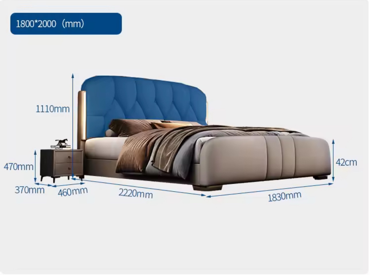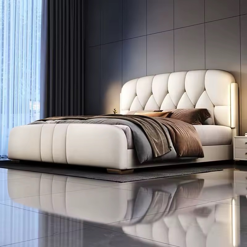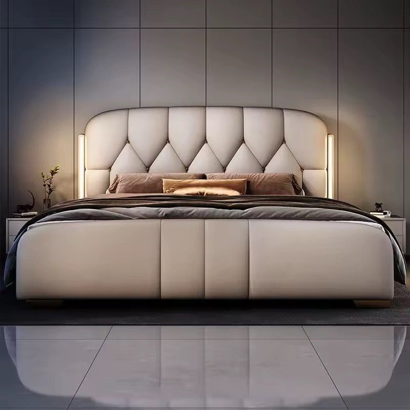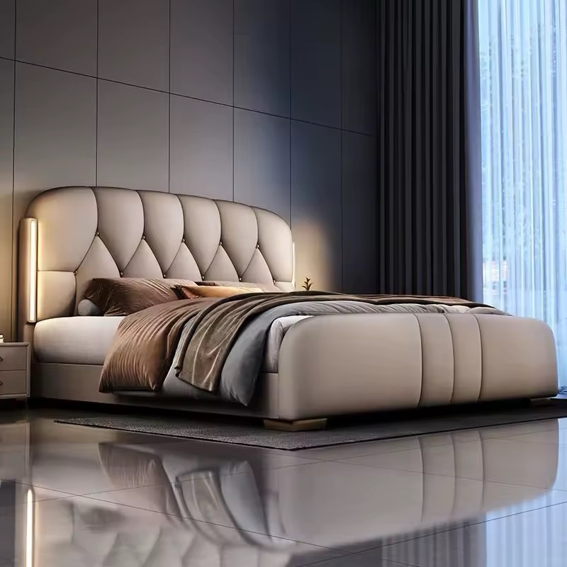 “سرير فاخر بإضاءة LED من الجلد الصناعي الميكروفايبر بحجم كينج، أثاث غرفة نوم فاخر، إطار خشبي، أسرة مبطنة ناعمة للمنزل